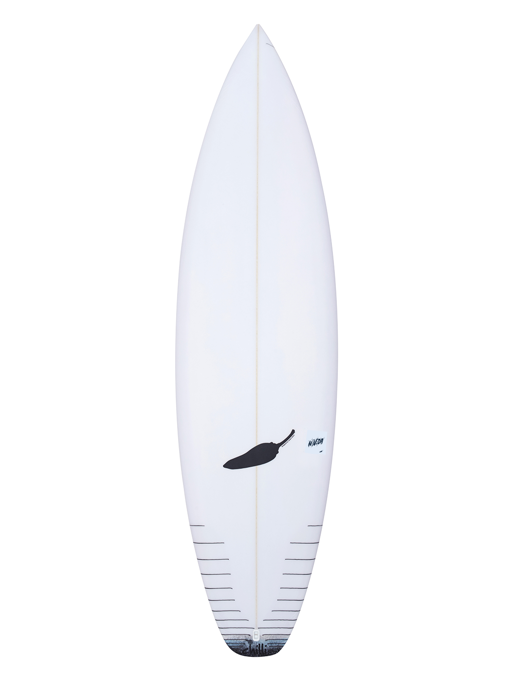 Keeping the Peppa series alive we have the Cherry Peppa. It features a similar bottom to the Red Peppa, slight single down to a very strong double concave and vee out through the tail. The vee bottom really compliments this board as it has a very flat rocker (which allows it to be uber fast) making the transition from rail to rail nice and simple. Think, the days you rock up and it's 1 foot summer slop, you won't be driving home without salty hair and a smile on your face if you have this board in the quiver. It's the ultimate summer pal. Equipped with a 5 fin option for your choice of a quad set-up (which we highly recommend on a point break), or a thruster set-up for that shorey bash we all love to go for. Drop 5-6 inches from your shortboard (or 2-3 inches from your Rare Bird). This board has area for paddle power and stability for all levels of surfing. ® Chilli Surfboards